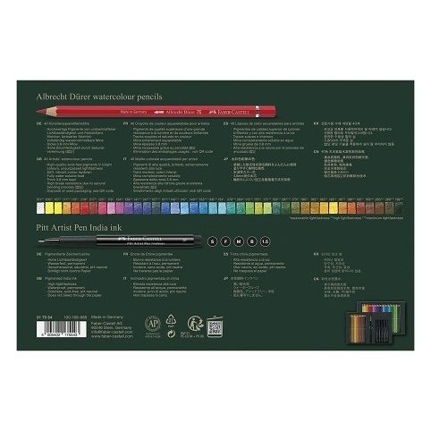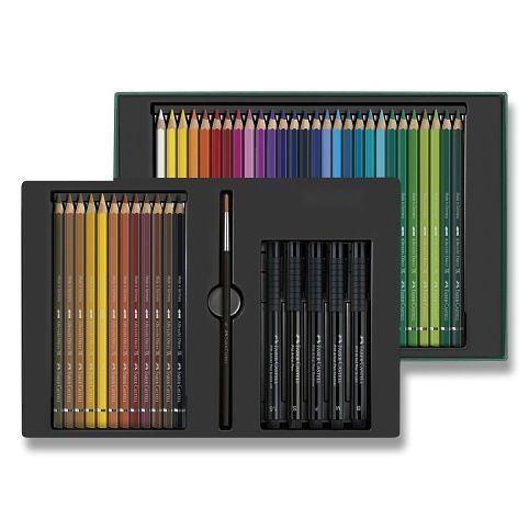 Sada obsahuje 40 kusů vysoce kvalitních dřevěných uměleckých pastelek Albrecht Dürer značky Faber-Castell, 5 kusů uměleckých popisovačů Pitt Artist Pen a štětec.