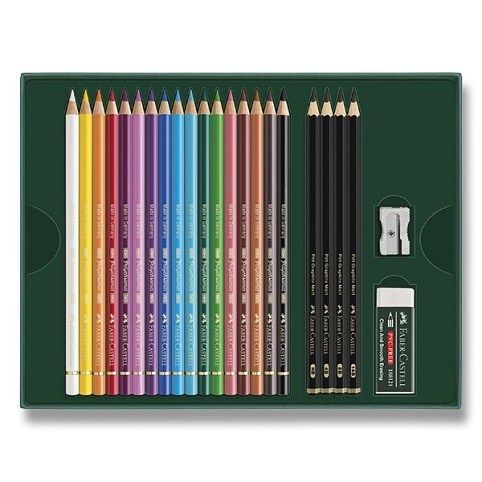 Sada 17 kusů vysoce kvalitních dřevěných uměleckých pastelek Polychromos značky Faber-Castell, 4 ks uměleckých grafitových tužek Pitt Graphite Matt, pryže a ořezávátka.