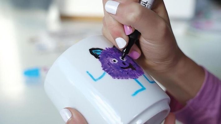 Jak na to: Nekreslete na místa, která přicházejí do styku s potravinami nebo nápoji. Pokud barva nebyla vypálena, můžete ji odstranit vodou. Nechte zaschnout 4 hodiny, vložte hrnek do studené domácí trouby a zafixujte barvy při teplotě 160 °C po dobu 90 minut. Hrnek nechte vychladnout a barvy v troubě ztuhnout. Design je pak možné mýt v myčce nádobí.