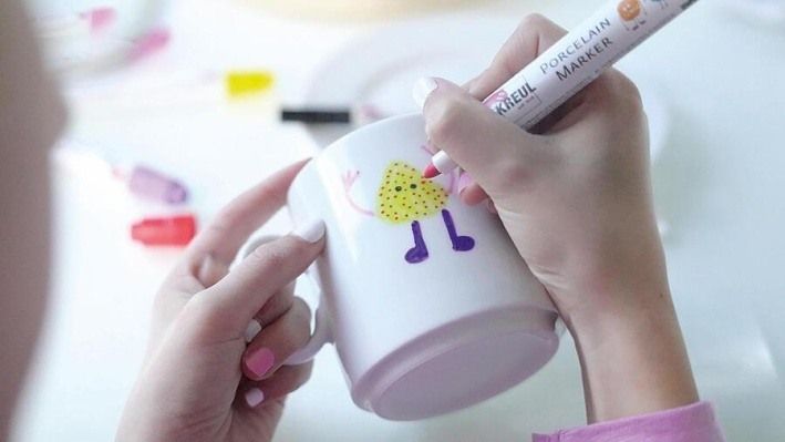 Jak na to: Nekreslete na místa, která přicházejí do styku s potravinami nebo nápoji. Pokud barva nebyla vypálena, můžete ji odstranit vodou. Nechte zaschnout 4 hodiny, vložte hrnek do studené domácí trouby a zafixujte barvy při teplotě 160 °C po dobu 90 minut. Hrnek nechte vychladnout a barvy v troubě ztuhnout. Design je pak možné mýt v myčce nádobí.