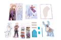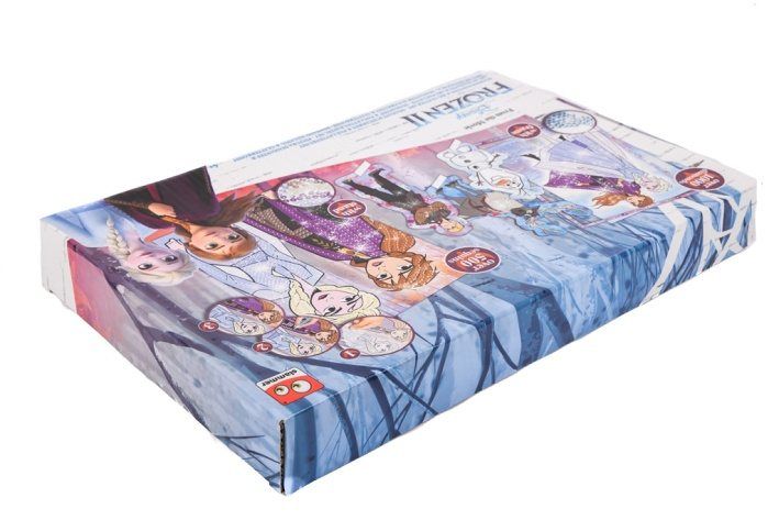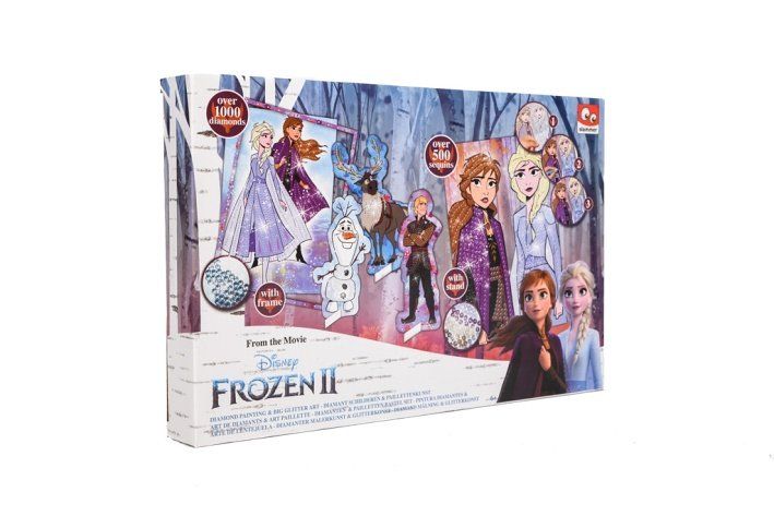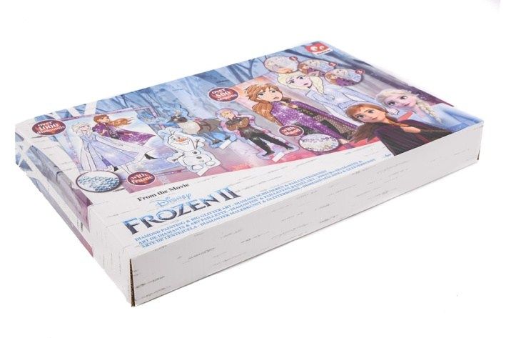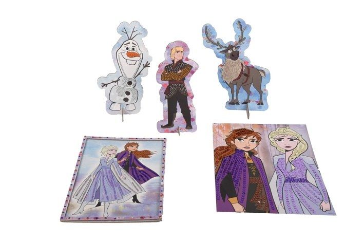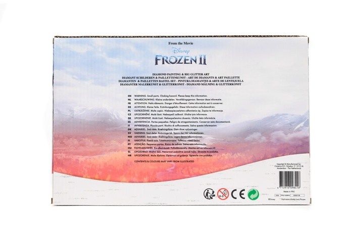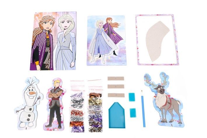 Dárková sada dvou obrázků Ledové království. Výrobek obsahuje pět obrázků obřázků, 6 pytlíčků s flitry, 6 pytlíčků s třptivými kamínky, aplikátor, rámeček, misku na kamínky, háčky.