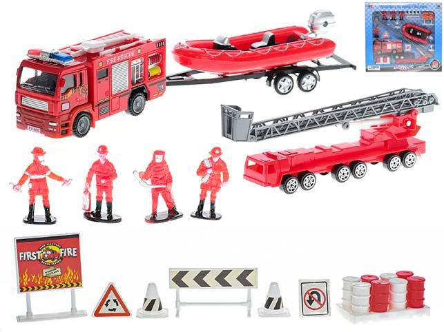 Sada hasiči - vozidla kov volný chod + figurky v krabičce