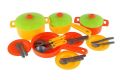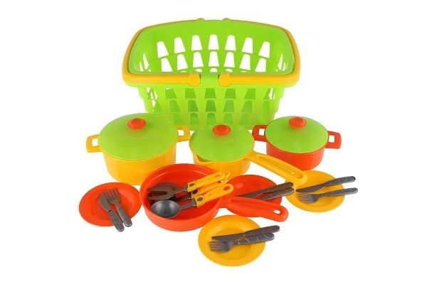 Sada hrnců + příbory v síťce plast v nákupním košíku 27x37x17cm