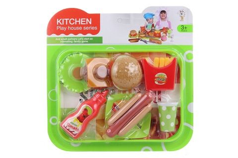 Sada potravin fastfood obsahuje hamburger který se dá rozložit na jednotlivé přísady ( houska, salát, karbanátek, sýr, rajče, majonéza), hranolky v kelímku, párek v rohlíku, nápoj, kečup, tácek. Rozměr balení cca 31 x 31 x 5 cm. Věk 3+