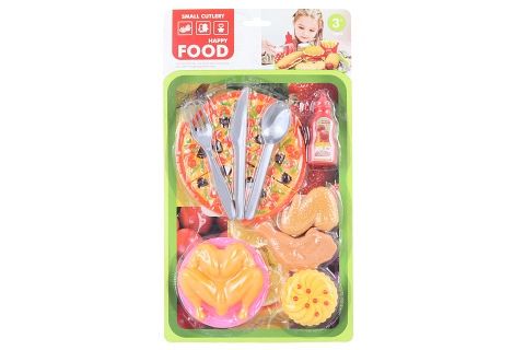 Sada jídla obsahuje pizzu rozdělenou na 6 dílků, vidličku, nůž, lžíci, kuřecí křídlo a stehno, kuře, talíř, dort a kečup. Rozměr balení cca 37 x 21 x 3 cm. Věk 3+
