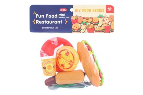 Sada potravin obsahuje tác s pizzou, bagetu, párek v rohlíku, nápoj, příbor. Rozměr balení cca 24 x 24 x 5,5 cm. Věk 3+