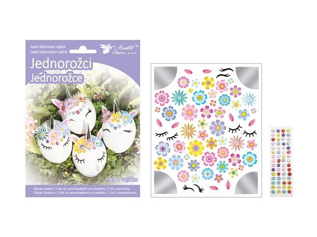 Sada k dekorování 4 ks vajíček - jednorožci. S těmito samolepkami snadno a rychle ozdobíte vajíčko. V momentě vytvoříte z obyčejného vajíčka hlavu jednorožce podle svých představ. Takto netradičně a originálně ozdobená vajíčka budou hlavní ozdobou Velikonoc. BALENÍ OBSAHUJE: - 1 arch se samolepkami - 1 arch s kamínky Sada je určena pro dekorování 4 vajíček. Návod: 1. Připravte si 4 natvrdo uvařená, vychladlá a suchá vejce. 2. Opatrně vyjměte pár očí z archu samolepek a přilepte na vejce. 3. Vyjměte zlatý roh a srolujte do kuželu. Ohněte průhledné části do stran a nalepte na vejce. 4. Vyjměte uši, ohněte konce do stran a přilepte k vajíčku. 5. Vyjměte květiny a přilepte k rohu a uším. Pro 3D efekt ohněte okvětní lístky. 6. Vyjměte kamínky z druhéro archu samolepek a přilepte na vajíčko. Uvedená cena je za 1 balení.