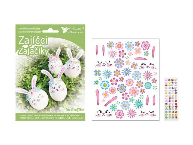 Sada k dekorování 4 ks vajíček - zajíčci. S těmito samolepkami snadno a rychle ozdobíte vajíčko. V momentě vytvoříte z obyčejného vajíčka hlavu zajíčka podle svých představ. Takto netradičně a originálně ozdobená vajíčka budou hlavní ozdobou Velikonoc. BALENÍ OBSAHUJE: - 1 arch se samolepkami - 1 arch s kamínky Sada je určena pro dekorování 4 vajíček. NÁVOD: 1. Připravte si 4 natvrdo uvařená, vychladlá a suchá vejce. 2. Opatrně vyjměte pár očí z archu samolepek a přilepte na vejce. 3. Vyjměte uši, ohněte konce do strach a přilepte k vajíčku. 4. Vyjměte květinky a přilepte je kolem uší. Pro 3D efekt ohněte okvětní lístky na stranu. 5. Vyjměte kamínky z druhéro archu samolepek a přilepte na vajíčko. Uvedená cena je za 1 balení.