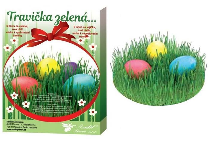 Sada k dekorování vajíček - travička zelená Svěží jarní travička nesmí chybět na žádném stole! Obsah balení: 6 tablet k barvení vajíček 4,2 g (červená, žlutá, modrá, oranžová, fialová, tyrkysová), zrna obilí (50 g) k vypěstování zelené travičky, papírový ubrousek a plastová miska k vypěstování travičky. NÁVOD NA BARVENÍ VAJÍČEK: 1. Připravte si pracovní podložku, hrnek, polévkovou lžíci, ocet, nůžky, papírové ubrousky, natvrdo uvařená vajíčka. 2. Pro obarvení dejte do hrnku 1 - 1,5 polévkových lžic octa a 1 - 1,5 polévkových lžic vody. Přidejte jednu barvící tabletu a míchejte, dokud se nerozpustí. Hrnek dolijte trochou vody. 3. Ponořte vajíčko do připravené barvící lázně, dokud se nezabarví požadovaný odstín. NÁVOD NA VYPĚSTOVÁNÍ TRAVIČKY: 1. Vytlačte z krabičky ovál dle naznačené perforace. V krabičce nechejte plastovou misku. 2. Na dno misky položte papírový ubrousek a na něj rovnoměrně rozmístěte zrna. Zalijte je vodou pokojové teploty. 3. Ubrousek je třeba pravidelně vlhčit, aby nezůstal suchý. Zrna vyklíčí během 7 dní. Travička může vydržet až měsíc, pokud bude ubrousek udržován vlhký. Můžete přisypat i hlínu.