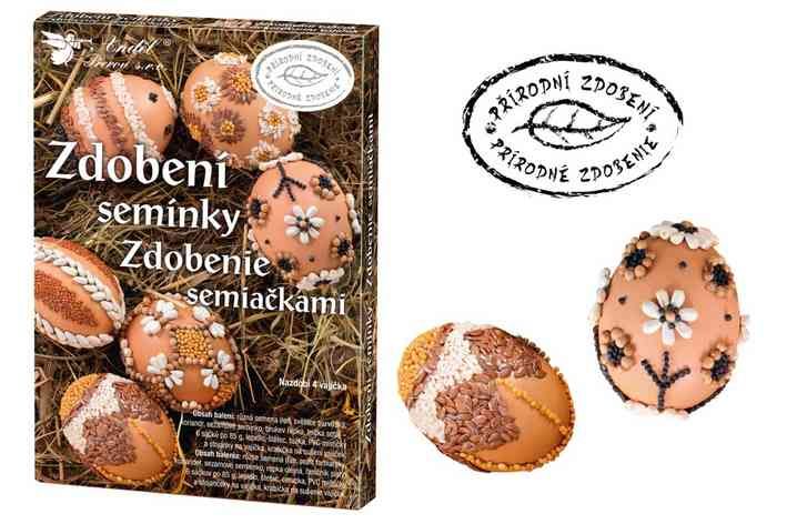 různá semena (len, světlice barvířská, koriandr, sezamové semínko, brukev řepka, lnička setá) - 6 sáčků po 85 g, lepidlo, štětec, tužka, PVC mističky a stojánky na vajíčka, krabička na sušení vajíček.
