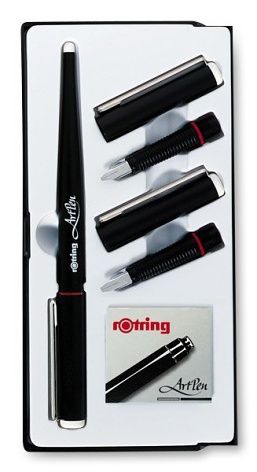 Kaligrafická sada obsahuje klasické kaligrafické pero s 3 rovnými hroty a 6 černých bombiček Rotring.Šíře hrotů je 1,5 mm, 1,9 mm a 2,3 mm.