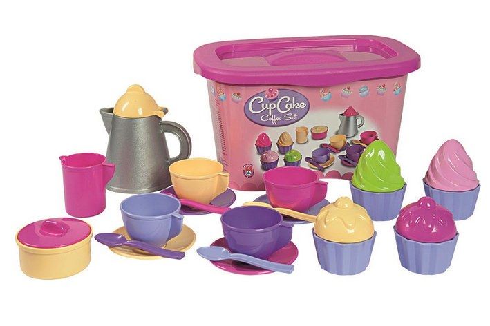 Sada kávový servis v boxu obsahuje konvičku na kávu, konvičku na mléko, cukřenku s víčkem, 4 hrnečky s podšálkem a lžičkou a 4 cupcake dortíky