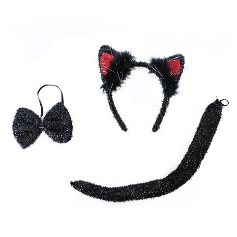 Karnevalové doplňky v kočičím stylu. Exkluzivní sada černé třpytivé barvy, obsahuje ocas, motýlka a čelenku s ušima zdobenou peřím.
