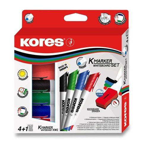 Sada obsahuje 4 ks popisovačů K-Marker na bílé tabule a flipcharty a magnetickou stírací houbičku.