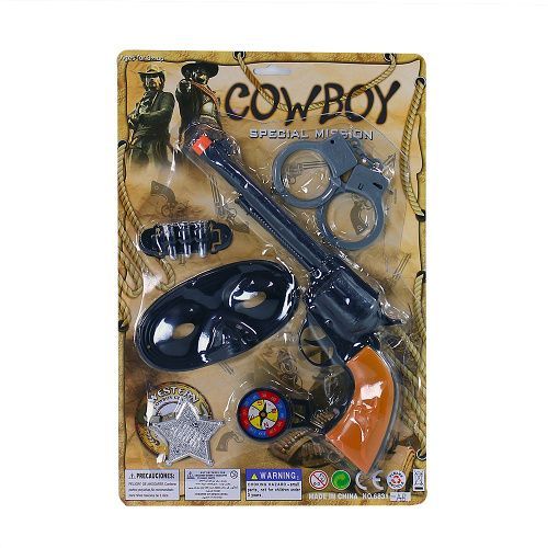 Stylová kovbojská sada! Tento set obsahuje pistol, odznak, náboje, masku, kompas a pouta. Pistol má délku cca 30 cm.