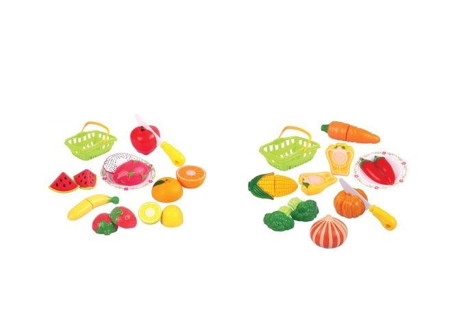 Ovoce a zelenina je vyrobena z kvalitního a odolného plastu. Každá zelenina se skládá ze dvou částí spojených pomoci suchého zipu. Pomocí bezpečného plastového nože se Vaše děti naučí rozkrojit ovoce a zeleninu a zároveň tak rozvíjí manuální dovednosti.
