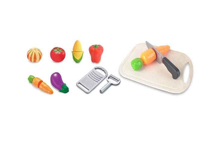 Zelenina je vyrobena z kvalitního a odolného plastu. Každá zelenina se skládá ze dvou částí spojených pomoci suchého zipu. Pomocí bezpečného plastového nože se Vaše děti naučí rozkrojit zeleninu a zároveň tak rozvíjí manuální dovednosti. Balení obsahuje také prkénko a nůž pro bezpečné krájení.