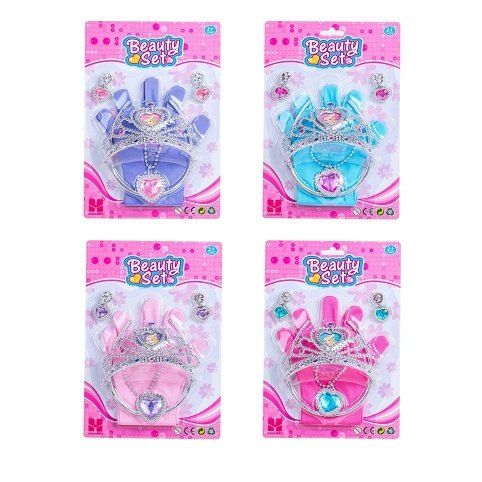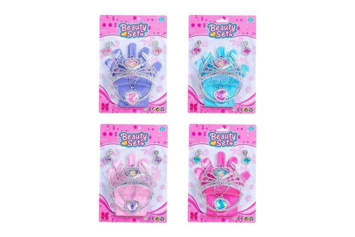 Šperky a rukavičky sada doplňků. Korunka 12,5 cm. Obsah balení - rukavičky, korunka, čelenka, náhrdelník, 2 náušnice. 4 varianty - modrá, fialová, růžová, červená.
