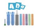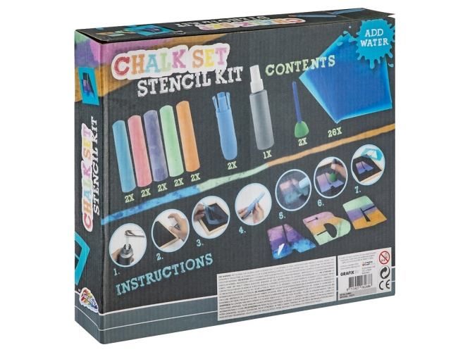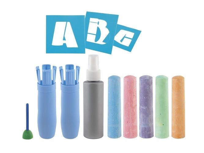 Sada kříd se šablonami. Součástí balení jsou křídy, dva držáky na křídy, houbička, sprej na vodu a šablony.