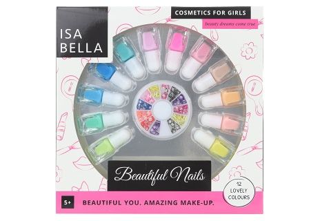 Sada 12 různě barevných laků na nehty. Balení obsahuje také ozdoby na nehty. Rozměry balení cca 21 x 21 x 2,5 cm. Věk 5+