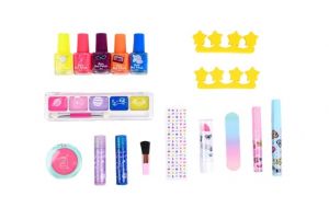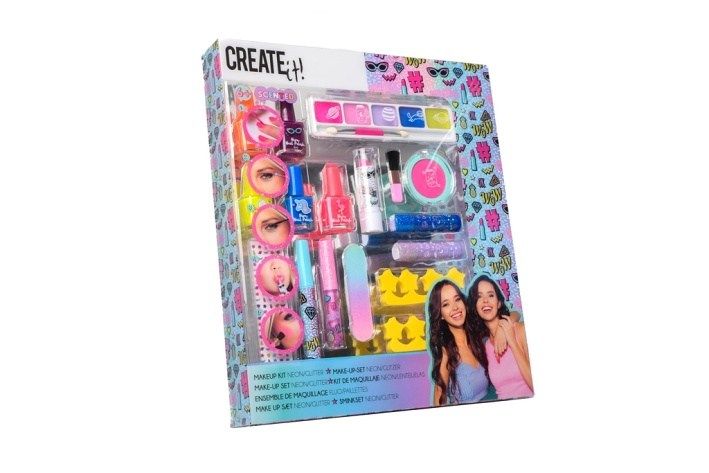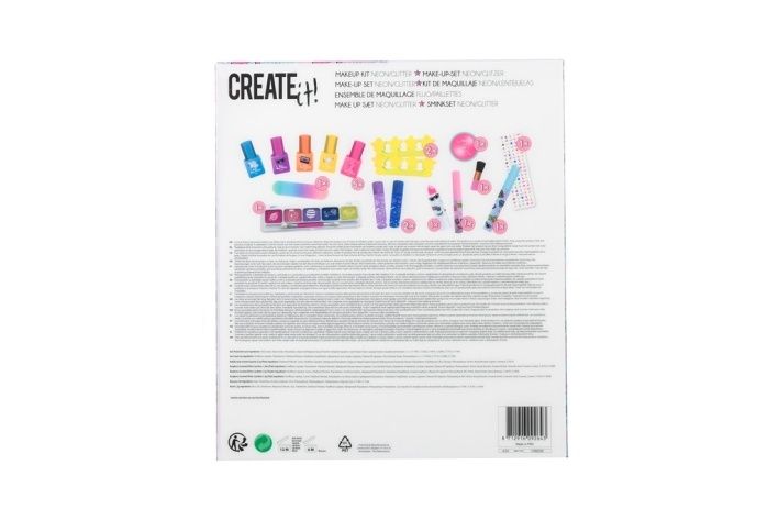 Sada Make up „Neon/třpytivých“ barvách – je sada přípravků na líčení v třpytivých a neonových barvách. Sada obsahuje stíny, aplikátor, štětec, laky na nehty, pilník, rtěnku, lesk na rty, řasenku, separátor na nehty, tvářenku. Dermatologicky testováno, odpovídá přísným normám EU.