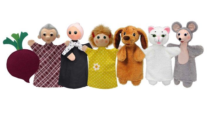 Sada 7 ks maňásků v průhledném sáčku. Děda, babička, vnučka, pejsek, kočička a myška. Řepa jako prstový maňásek.