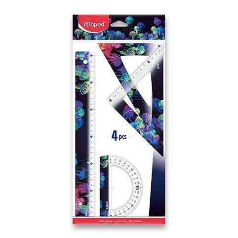 4dílná sada kvalitních rýsovacích potřeb v atraktivním designu s motivem podmořského světa. Sada má vysoce kvalitní značení, stupnice jsou natištěny za použití UV inkoustu a jsou maximálně odolné.