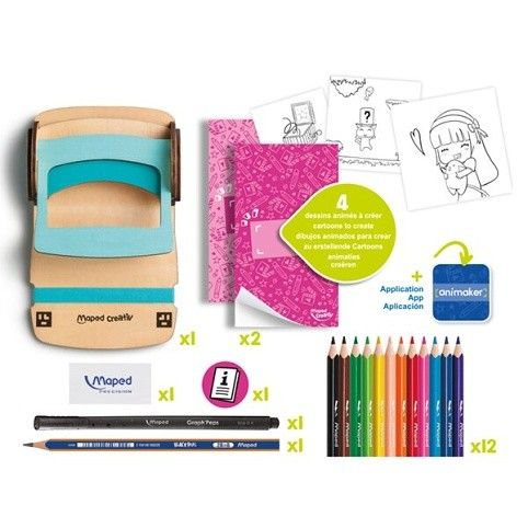 Kreativní sadaMaped Creativ Animaker Flip Poetic pro vytváření animací jako od profesionála. Přetvořte své kresby na komiks pomocí flip bloku a bezplatné mobilní aplikace Animaker. Díky předlohám můžete vytvořit až 4 komiksy. Snadná tvorba kreseb, které se díky flip blokům a mobilní aplikaci promění ve skutečné komiksy. Vybarvujte, dotvářejte své vlastní příběhy, které můžete následně sdílet. Opakované použití, neboť dřevěný stojánek pro uchycení flip bloku je vhodný pro jakýkoliv blok standardizované velikosti. Vhodné pro děti od 7 let.