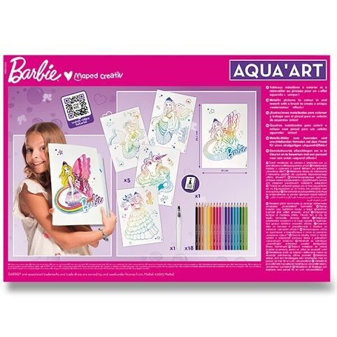 Kreativní sada Maped Creative Barbie Aqua‚Art je ideální pro tvorbu obrázků s „efektem akvarelu“. Metalizované obrázky k vybarvení a následné úpravě štětcem pro jedinečný „akvarelový efekt“. Metalické obrysy zabrání nechtěnému přetažení barvou. Vhodné pro děti od 6 let.