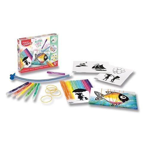 Sada obsahuje nástavec pro foukání, 6 barevných fixů, 4 předtištěné předlohy a sadu gumiček, se kterými se docílí efektních airbrush výsledků.