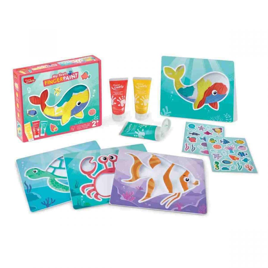 Kreativní sada Maped Creativ Early Age My First Finger Paint - moje první prstové barvy pro první zábavnou výtvarnou zkušenost. Barva se nanáší přímo prsty dovnitř karty, která se po zavření promění v barevného mořského tvora,jehož lze dále dozdobit samolepkami. Díky jednoduchému postupu bez štětců má každé tvoření zaručeně povedený výsledek a barvy lze po dokončení využít i pro další tvoření.