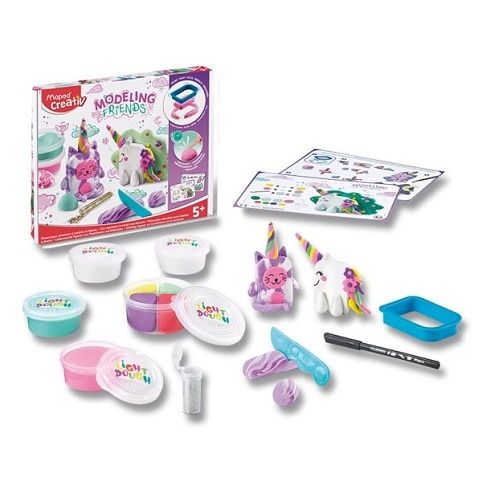 Dětská kreativní sada Maped Creativ Modeling Friends Magical na modelování pomocí tvarovací formy. Sada obsahuje tvarovací formu, modelovací hmotu ve 4 základních barvách (4 x 18 g) a ve 4 doplňkových barvách v plastové nádobce (1 x 31 g), černý fix, plastový nožík, 2 barevné předlohy a tubu zlatých flitrů na zdobení. Vhodné pro děti od 5 let.