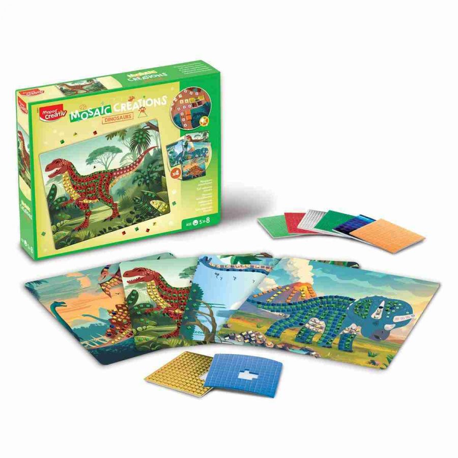 Kreativní sada Maped Creativ Mosaic Creations Dinosaurs umožňuje dětem ozdobit čtyři působivé dinosaury pomocí samolepicí mozaiky a vydat se na kreativní cestu do světa dinosaurů. Díky jednoduchému principu bez lepidla je aktivita snadná a přehledná, přičemž každá barva mozaiky odpovídá určitému číslu. Hravou formou tak děti rozvíjejí jemnou motoriku, soustředění i kreativní myšlení.