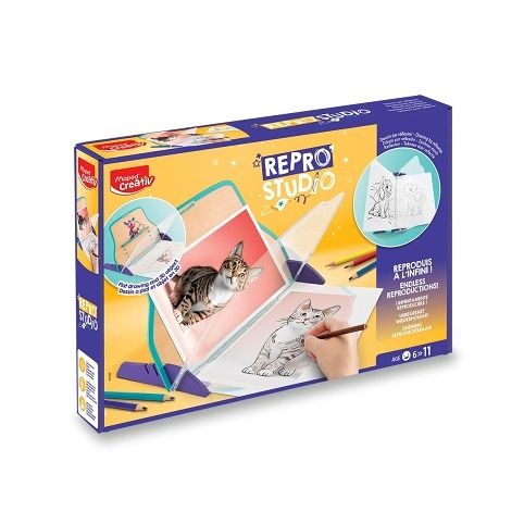 Kreativní sada Maped Creativ Repro'Studio umožňuje dětem snadno a zábavně reprodukovat svět kolem sebe pomocí optického odrazu přes sklo. Stačí umístit obrázek, fotografii nebo předmět na podložku, podívat se skrz speciální skleněnou desku a motiv se „kouzelně“ objeví na papíře. Děti tak mohou obkreslovat jak ploché obrázky, tak i trojrozměrné předměty. Konstrukce je navržena pro pohodlné používání praváky i leváky. Ideální pro rozvoj kreativity, kreslířských dovedností a pozorovací schopnosti.Vhodné pro děti od 6 let.