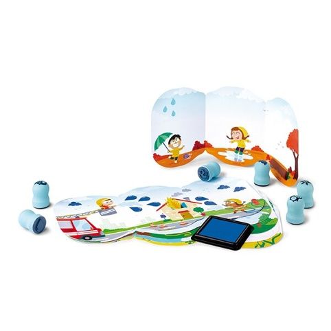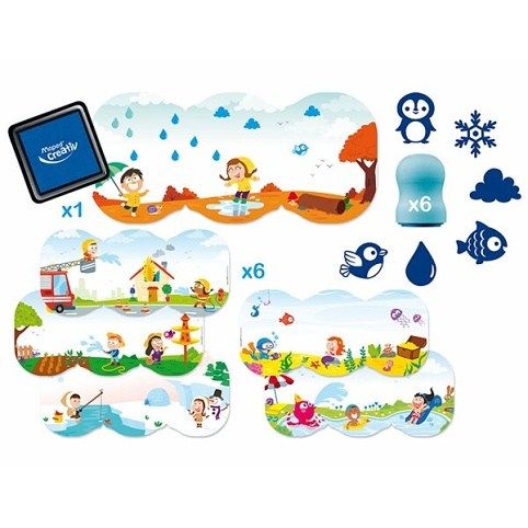 Souprava obsahuje razítka, s dětskými motivy, která jsouspeciálně navržena pro malou ručku a díky měkkému povrchu se příjemně drží. V praktickém kufříku je 6 plakátků, 6 razítek, a polštářek s inkoustem, který jde lehce setřít z dětských prstů.