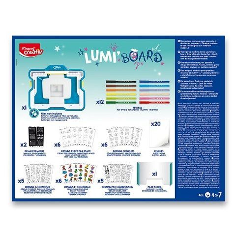 Kreativní kufřík, který funguje jako předloha pro kreslení. Do kufříku vložíte obrázek, který se podsvítí a obrázek tak můžete překreslit na papír. Souprava obsahuje 250 předloh s obrázky, 12 barevných fixů Maped Color‚Peps Ocean, 20 bílých papírů. Kufřík je na 4 LR6/AA baterky (nejsou součástí).Vhodné pro děti od 4 let.