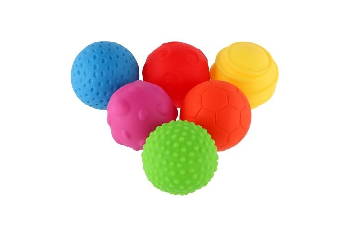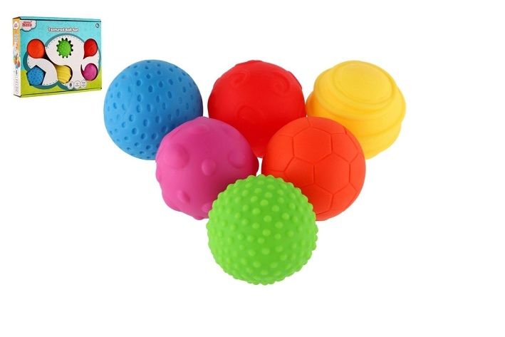 Sada 6 barevných gumových míčků. Každý míček má na svém povrchu jinou texturu.