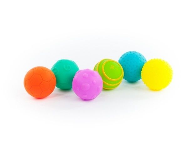 Sada 6 barevných gumových míčků. Každý míček má na svém povrchu jinou texturu.