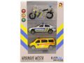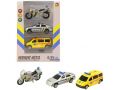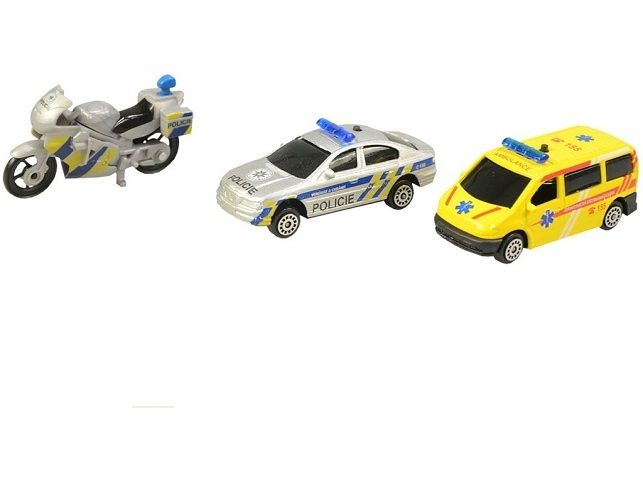 Sada ambulance a policie v českém designu. Znáte z našich silnic. Záchranářská sada policejní motorky (plast), policejního auta a dodávky ambulance (kov a plast) z produktové řady City Collection. Ambulance a auto s houkačkou (světlo a zvuk). Délka motorky: 7 cm. Délka policejního auta: 8 cm. Délka ambulance: 8 cm. Český design. Český box.