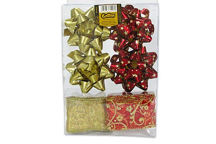 Sada na balení v barvě zlatá a červená, obsahuje 4 rozety a 2 mašle z organzy.