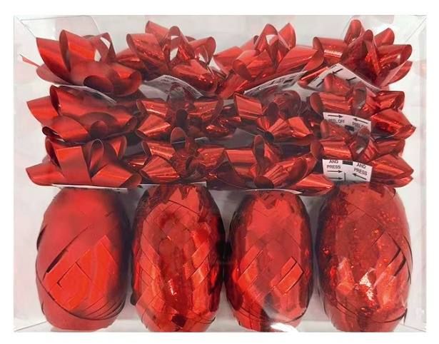 Sada na balení dárků červená, rozeta 5 x 2 x 5 cm 12 ks, stuha 0,5 cm x 10 m 4 ks