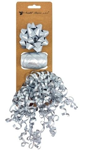 Sada na balení dárků stříbrná, rozeta 7 x 3,5 x 7 cm, stuha 0,5 cm x 10 m, kudrlina s lepí