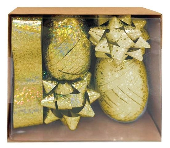 Sada na balení dárků zlatá, rozeta 5 x 2 x 5 cm 4 ks, stuha 0,5 cm x 10 m 2 ks, stuha 2 cm