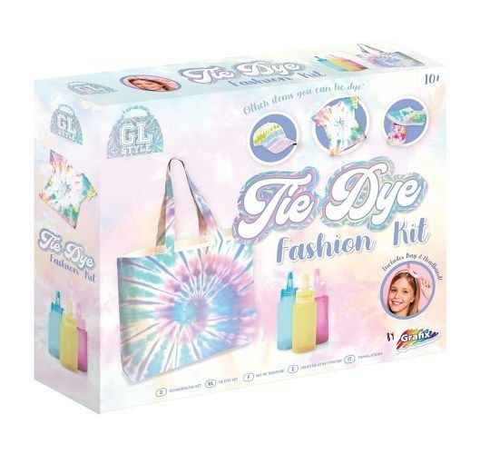 Sada na batikování – nabatikuj si pomocí sady tričko, boty, kabelku… Sada obsahuje stuhu do vlasů, tašku, tři barvy na batikování – žlutou, růžovou a modrou.