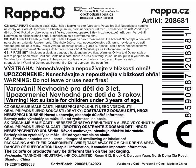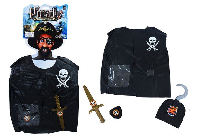 Parádní karnevalový kostým s motivem piráta je určen pro chlapečky ve věkovém rozmezí 3-7 let (104-122 cm). Balení obsahuje plášť, plastovou dýku a hák.