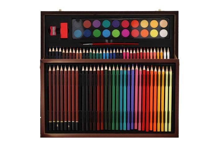 Velký kreativní výtvarný box, hodící se každému malému umělci, aby měl veškeré nutné potřeby přehledně v praktickém kufříku kdykoli u sebe! Kufr obsahuje pastelky, ořezávátko, gumu a vodové barvy se štětcem (celkem 91 ks).