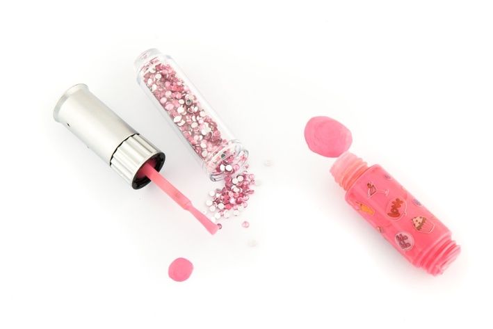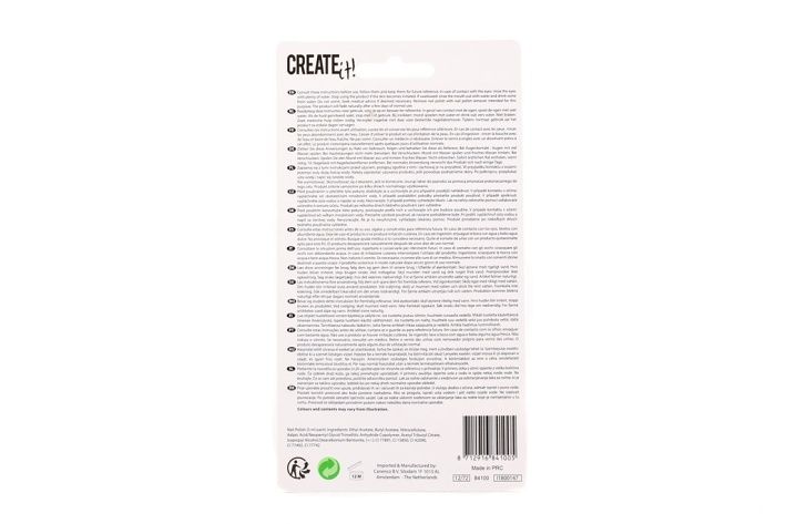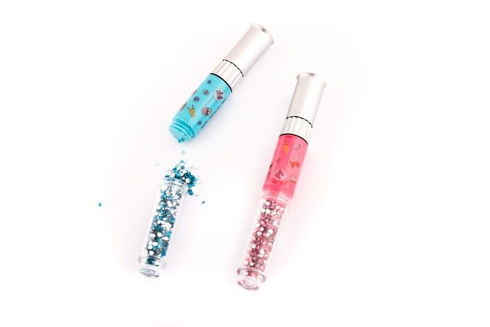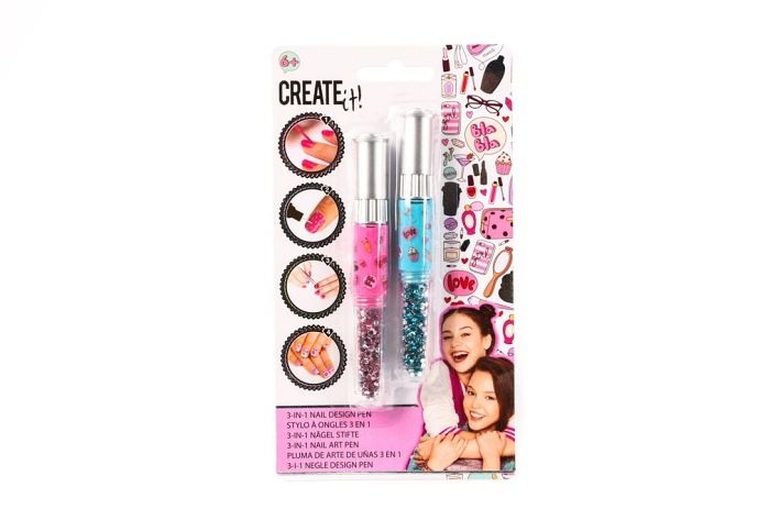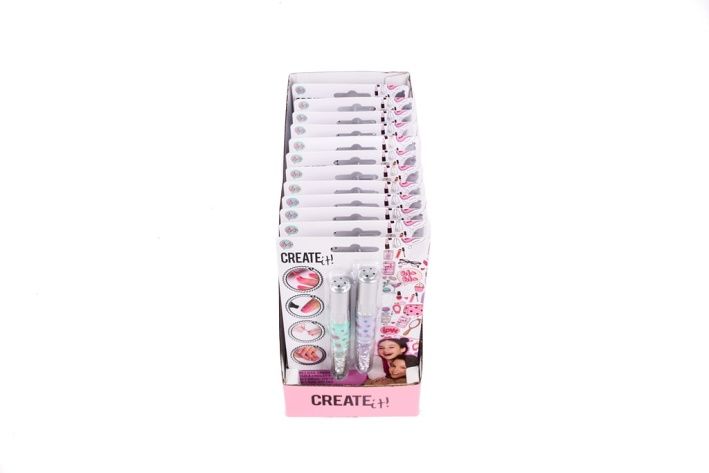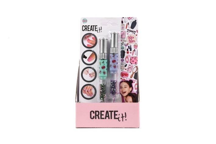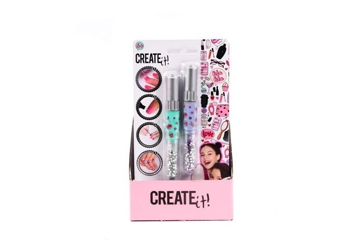 Obsahuje 2 tuby s třpytkami, nálepkami a lakem na nehty (2 × 5 ml) se štětcem a tenkým kreslícím hrotem. Různé druhy.