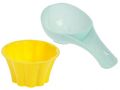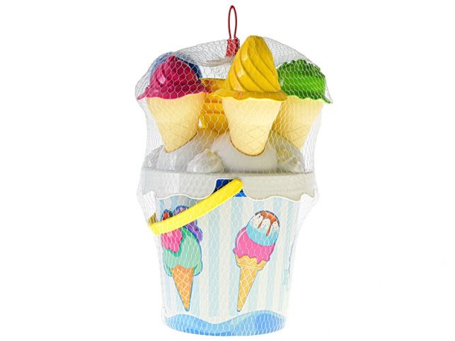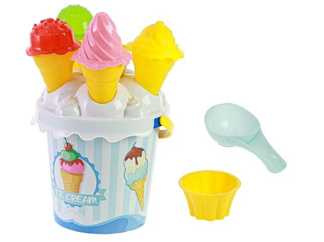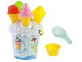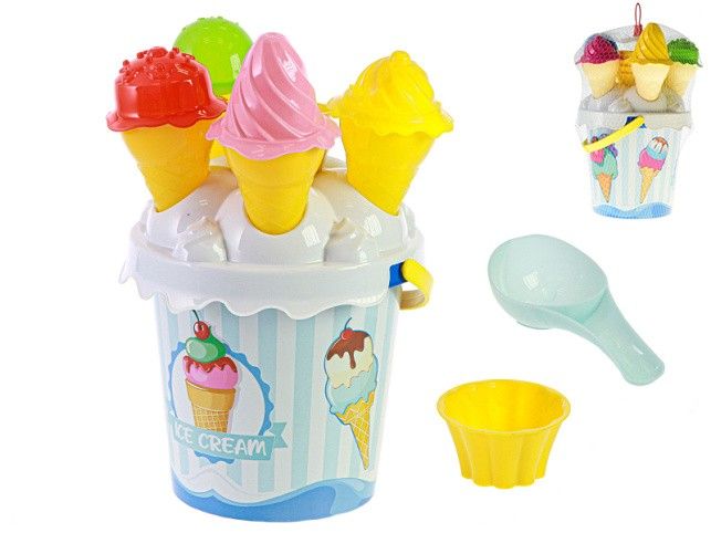 Dětská sada na hraní na pískoviště, na zahradu nebo do vody v podobě cukrárny. Obsahuje kyblíček, 4 kornoutky, 4 barevné čepičky ve tvaru zmrzliny, naběračku a bábovičku ve tvaru malého kelímku.