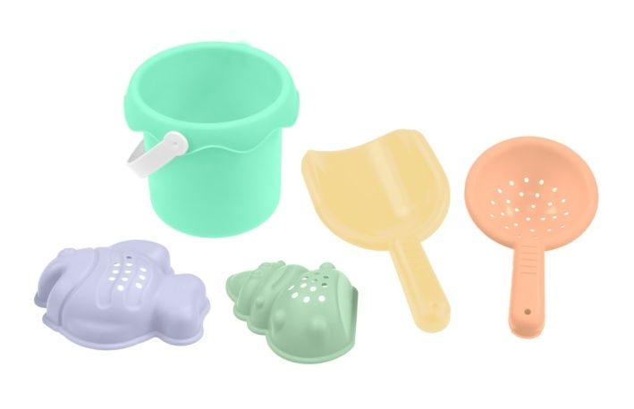 Sada na písek 5ti dílná – obsahuje kyblík, lopatičku, hrabičky a bábovičky .