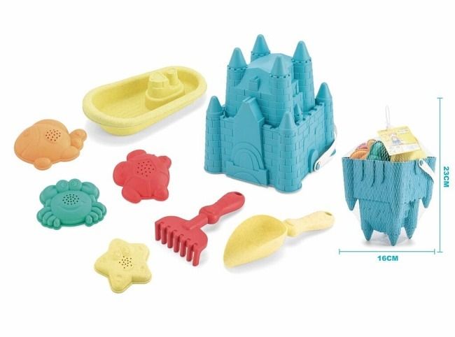 Sada na písek 8 ks. Rozměry 16x23 cm. Obsahuje kbelík hrad, lopatka, hrabičky, loď, 4 formičky.